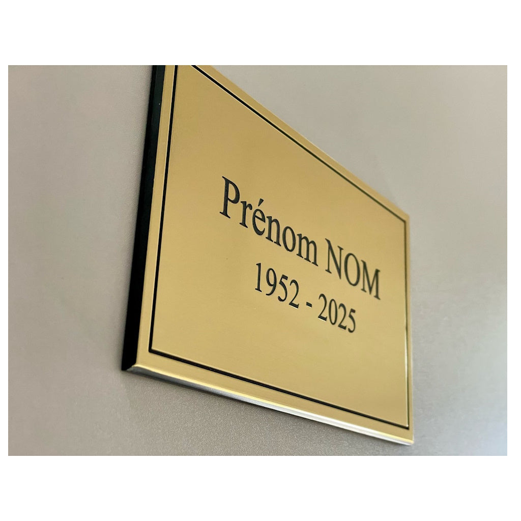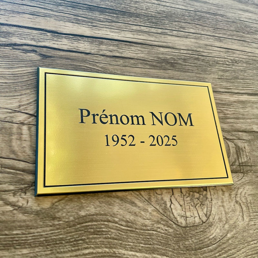 Sa finition or brossé offre un rendu sobre et raffiné, idéal pour un hommage discret et respectueux. Avec ses dimensions 16 × 10 cm et une épaisseur de 4 mm, elle permet une gravure nette et parfaitement lisible (nom, prénom, dates…).