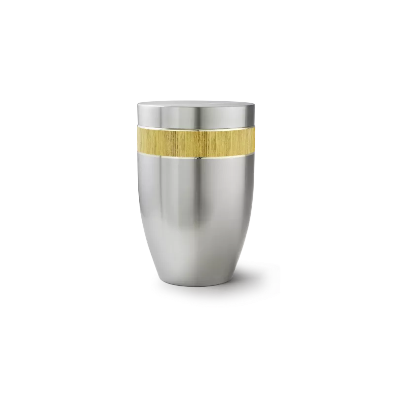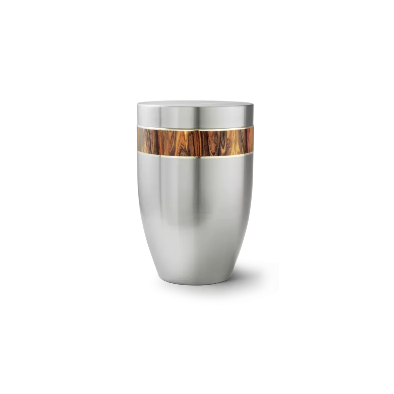 Cette urne funéraire en acier brossé allie la solidité du métal à la chaleur du décor bois, disponible en pin ou palissandre de Rio. Son design sobre et élégant évoque à la fois la nature et la sérénité, pour un hommage empreint de respect et d’authenticité.