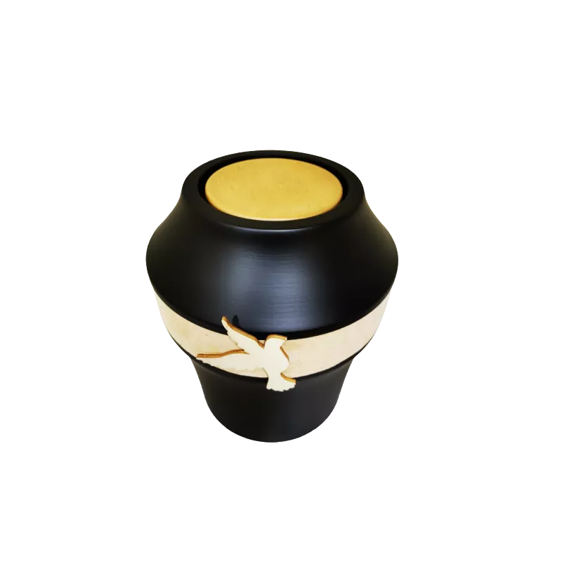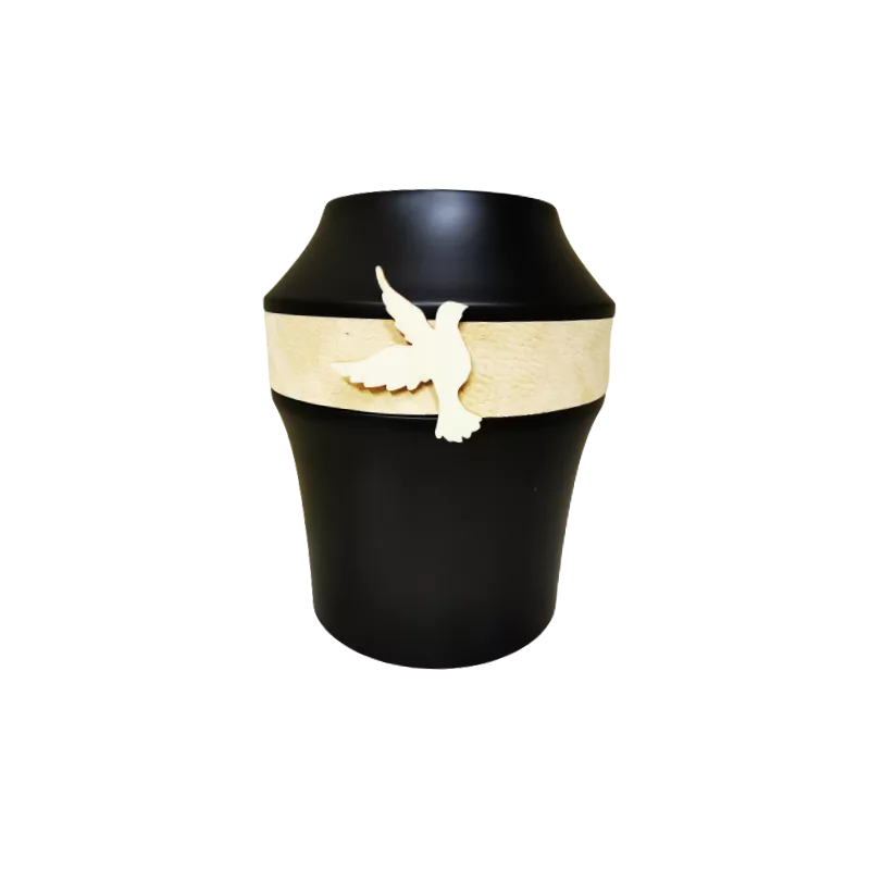 Urne funéraire en bois avec décor bandeau en cuir et colombe en bois