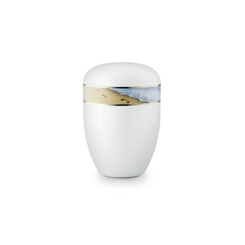Cette urne funéraire en acier blanche se distingue par sa sobriété et son élégance, rehaussée d’un délicat liseré doré. Son design lumineux...