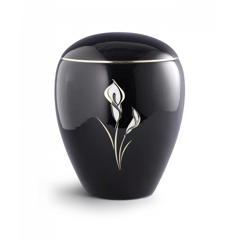 Cette urne funéraire en céramique arbore un noir profond brillant rehaussé d’un décor d’arum doré, symbole d’élégance, de pureté et de sérénité. Son design raffiné en fait une pièce à la fois moderne et intemporelle, idéale pour un hommage empreint de respect et de paix.