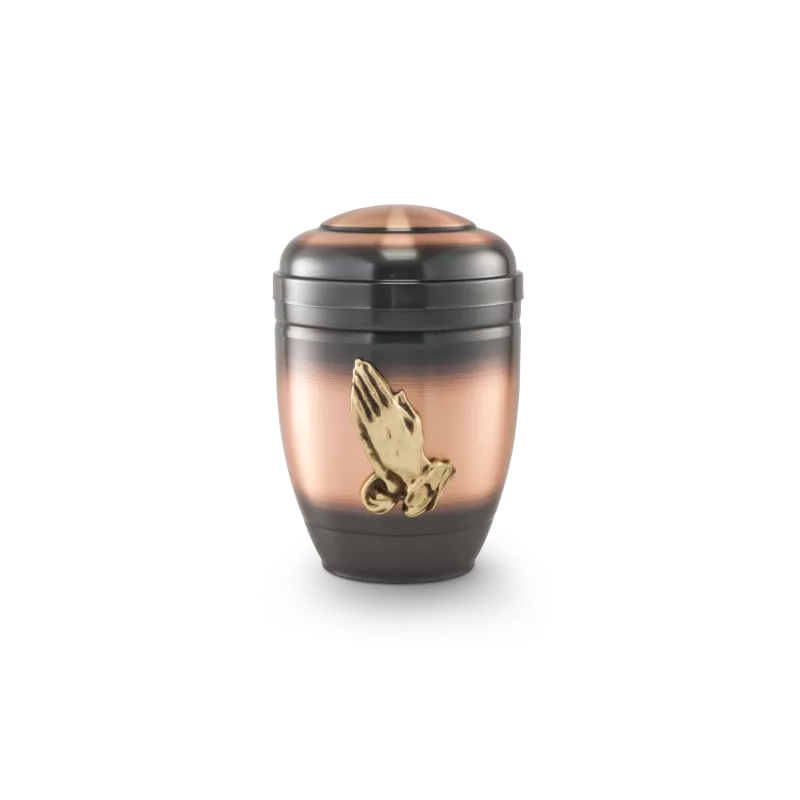 Cette urne funéraire en cuivre galvanisé présente un design raffiné, orné de mains en laiton, symbole d’unité et de recueillement. Robuste et élégante, elle offre une excellente durabilité tout en conservant une finition soignée.